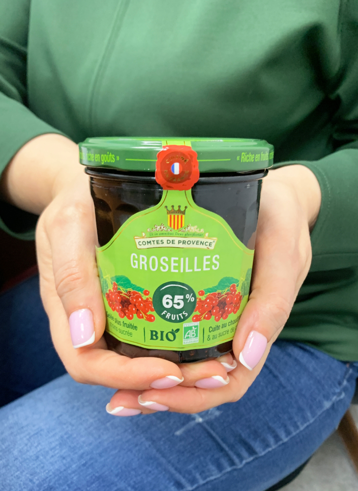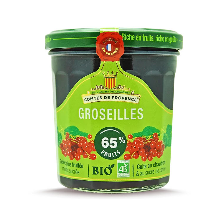 Состав: концентрированный сок красной смородины (65%), тростниковый сахар, агент желирующий: фруктовый пектин, окислитель: концентрированный лимонный сок.
