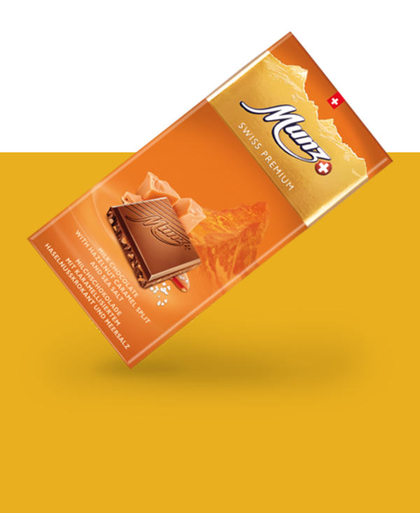 Munz Swiss Premium milk caramel & salt. Солено-сладкое сочетание сливочного молочного шоколада с хрустящим карамелизированным фундуком и щепоткой швейцарской альпийской соли. Незабываемое угощение для всех, кто любит неожиданные сочетания.