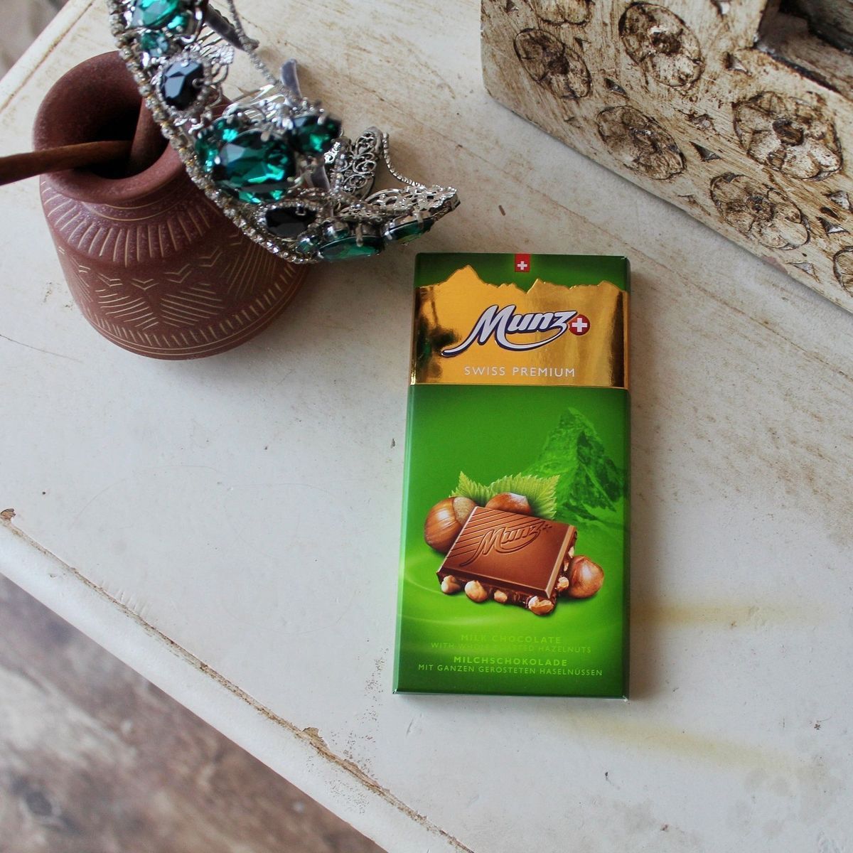 Munz milk chocolate with hazelnuts. Хрустящие обжаренные лесные орехи, покрытые лучшим швейцарским молочным шоколадом, создают неповторимый аромат. Особое наслаждение для всех любителей орехов.